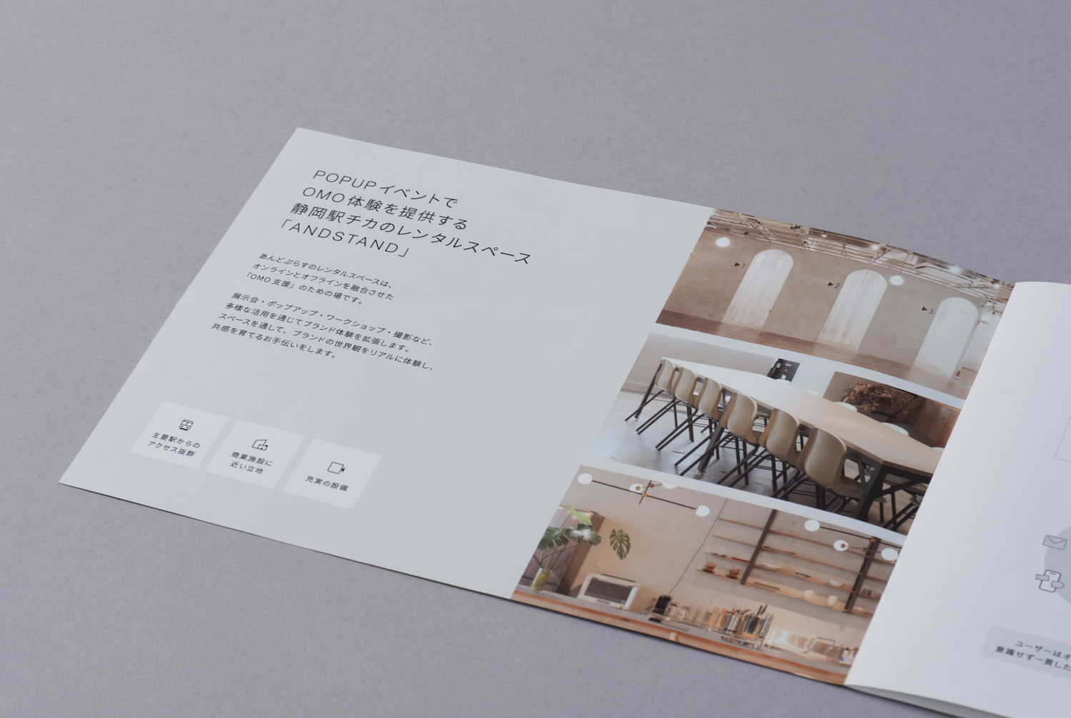 また設備に関するお問い合わせが多いことを踏まえ、家具や機材は視認性を重視した写真構成とし、表紙はANDSTANDの温かみが感じられるやや暖色寄りのトーンで仕上げました。